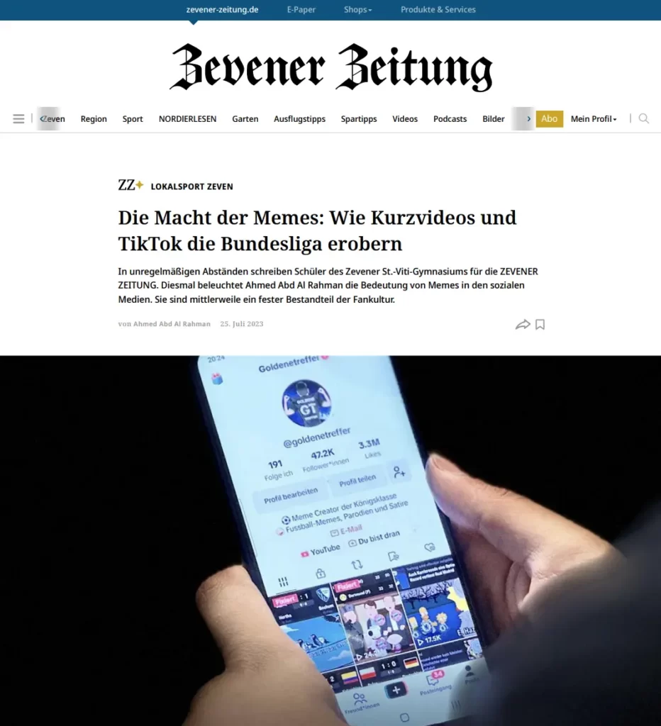 In der neusten Ausgabe der Zevener Zeitung beleuchtet Ahmed Abd Al Rahman die faszinierende Rolle von Fußballmemes in den sozialen Medien. Diese Memes erfassen nicht nur die Emotionen der Fans, sondern dienen auch als Unterhaltung und schaffen eine Verbindung zwischen Gleichgesinnten. Sie spiegeln Momente der Freude, des Frusts und der Ironie wider und fördern so das Gemeinschaftsgefühl.