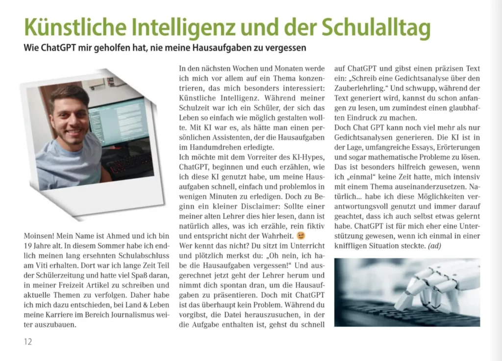 Diesen Monat ist unser erster Artikel in der Ausgabe von „Land und Leben“ erschienen. Unsere Artikel werden sich beim Regionalmagazin auf KI-Tools konzentrieren, und zeigen, was damit alles möglich ist. Den Anfang machen wir mit Chat-GPT, dem Vorreiter des KI-Hypes. Ein äußerst nützliches Tool, wenn man weiß, wie man es nutzt. Egal ob Schüler, Student oder Arbeitnehmer, dieses Tool macht euch das Leben einfach!